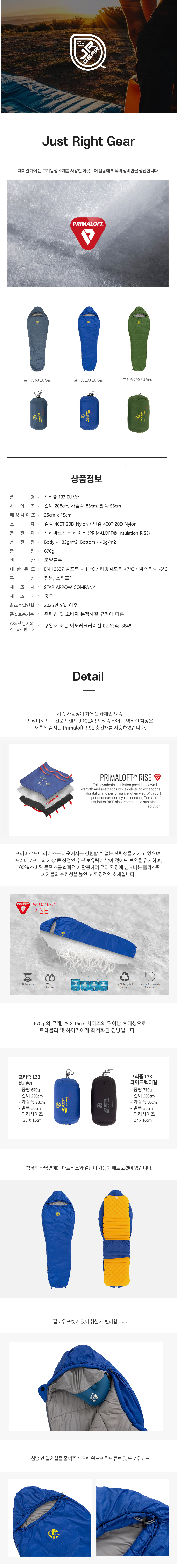 [제이알기어] 프리즘 133 프리마로프트 침낭 (로얄블루)