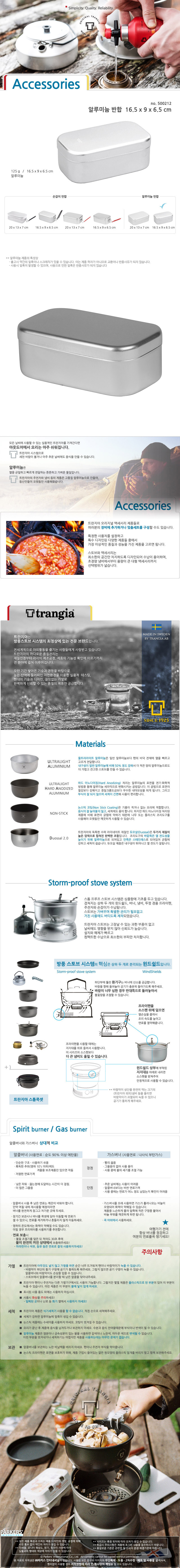 ABOUT Trangia... 트란지아의 까다로운 품질관리는 재질선정에서부터 각각의 제조공정, 제품의 기능성 확인에 이르기까지 전 분야에 걸쳐 이루어집니다. 트란지아 오리지널은 원래의 제품특성인 가볍고, 사용하기 쉽고, 무엇보다 어떠한 날씨에서도 믿을 수 있는 스토브 시스템을 제공하며 다양한 재질, 사이즈 조합과 특색있는 악세사리군으로 구성되어 있습니다.