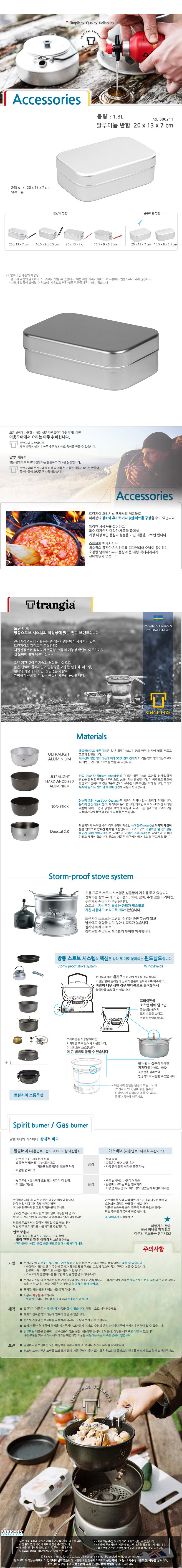 ABOUT Trangia... 트란지아의 까다로운 품질관리는 재질선정에서부터 각각의 제조공정, 제품의 기능성 확인에 이르기까지 전 분야에 걸쳐 이루어집니다. 트란지아 오리지널은 원래의 제품특성인 가볍고, 사용하기 쉽고, 무엇보다 어떠한 날씨에서도 믿을 수 있는 스토브 시스템을 제공하며 다양한 재질, 사이즈 조합과 특색있는 악세사리군으로 구성되어 있습니다.
