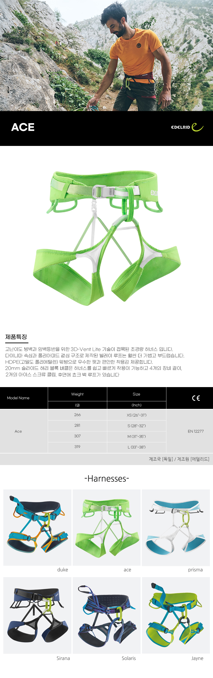 ABOUT Edelrid... EDELRID는 1863 년에 줄리어스 EDELMANN 칼 Ridder의에 의해 설립되었습니다. 이후 1953년 로프를 발명하고 생산, 현재까지 이어오고 있습니다.에델리드(EDELRID)는 세계적으로 사랑받고 있는 독일의 등반장비 브랜드입니다. 대부분의 제품이 독일과 유럽, 때 많이 사용되고 있으며 발수,투습력이 우수하여 세계 각국 원정국제산악연맹의 인증을 받아서 절대적인 신뢰를 제공합니다. 등반로프는 클라이밍과 고산 등반 대로부터 극찬을 받고 있는 품목입니다
